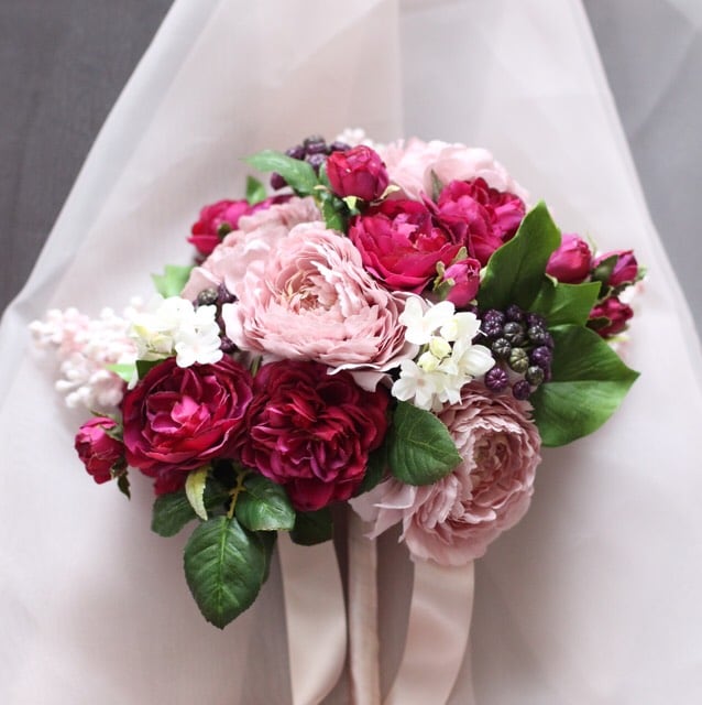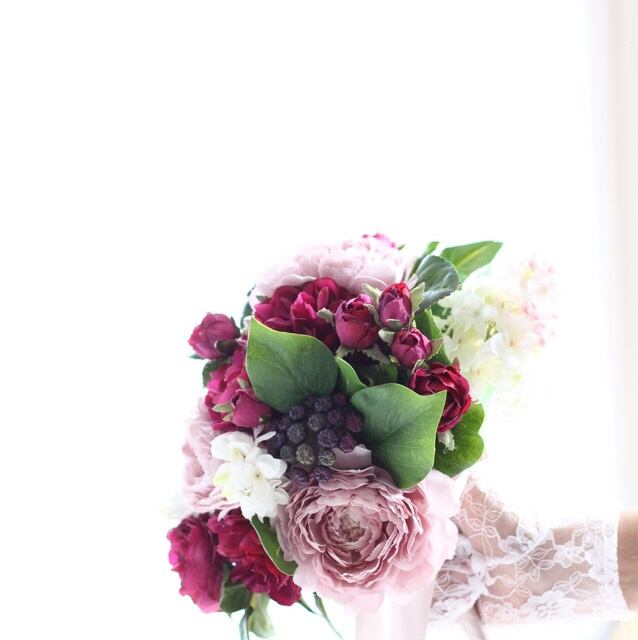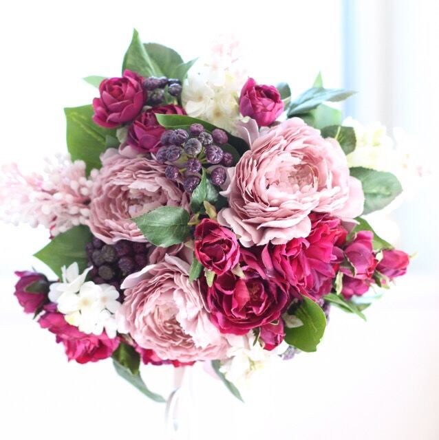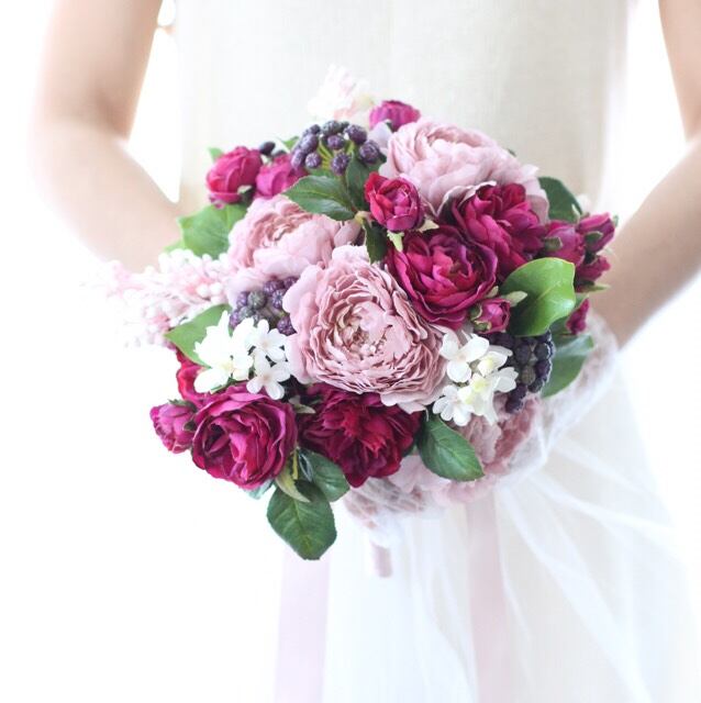 実物の素敵さだけでなく写真にもよくはえるピンクのウェディングブーケです。