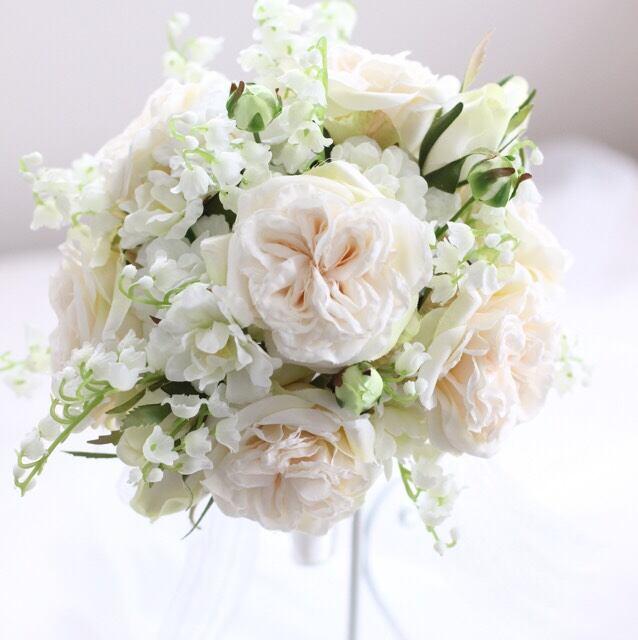 美しい花姿のスズランと、咲き方が高貴なイングリッシュローズ。そして純白のスプレーバラ。