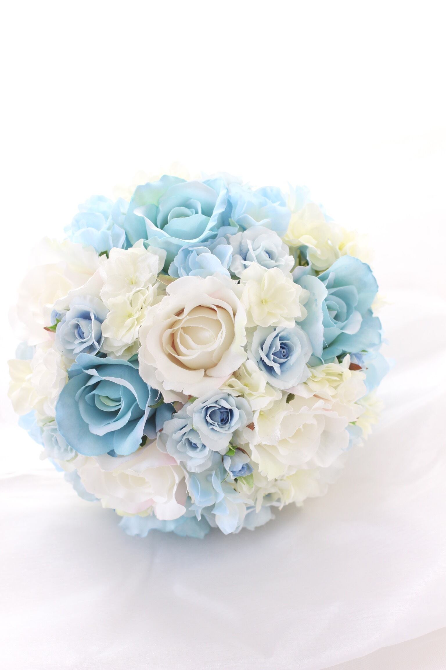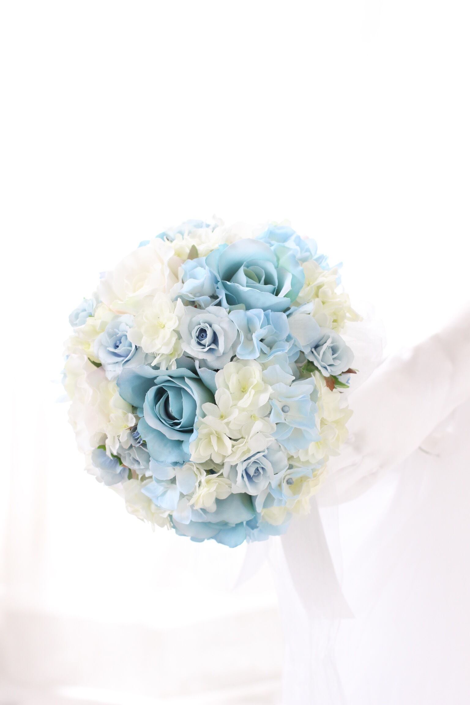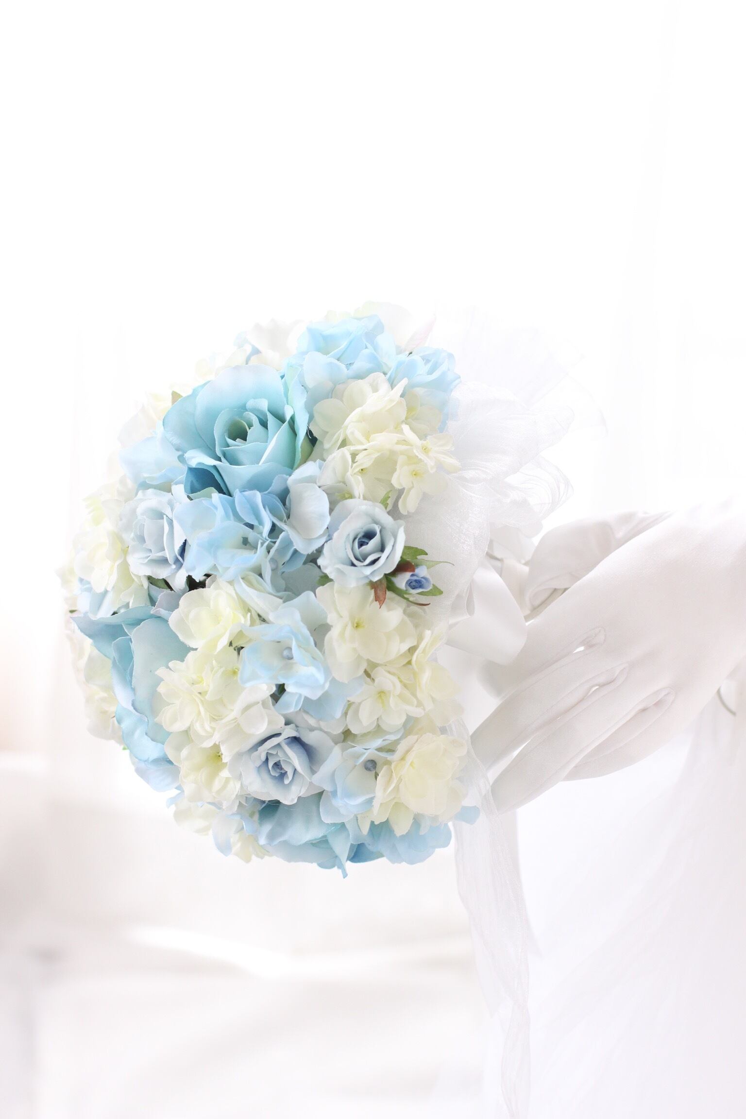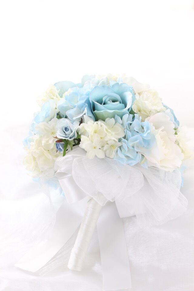 優しい水色のサムシングブルーブーケ ブートニア付き