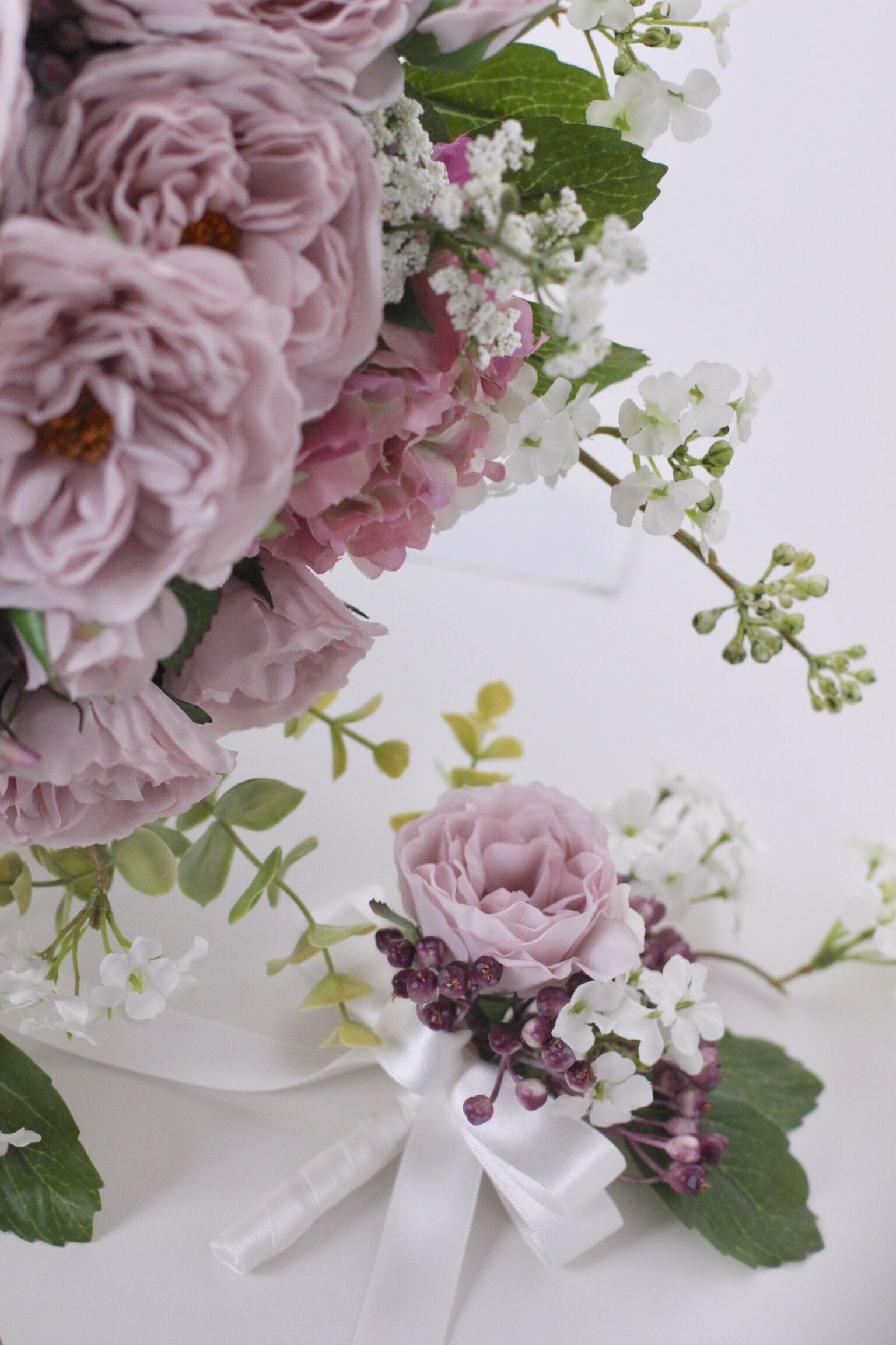 ピンクのバラのナチュラルクラッチブーケ ブートニア付き