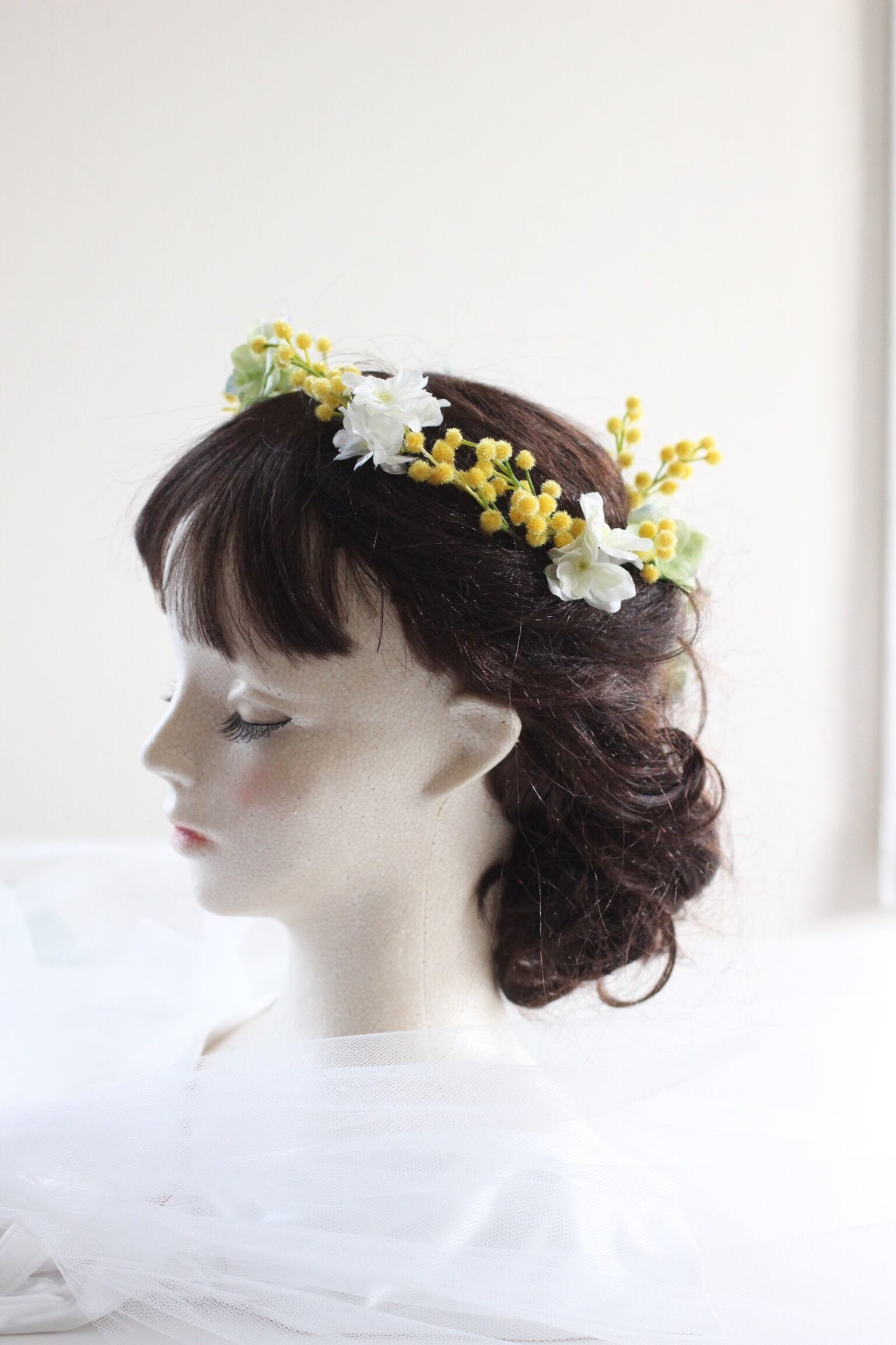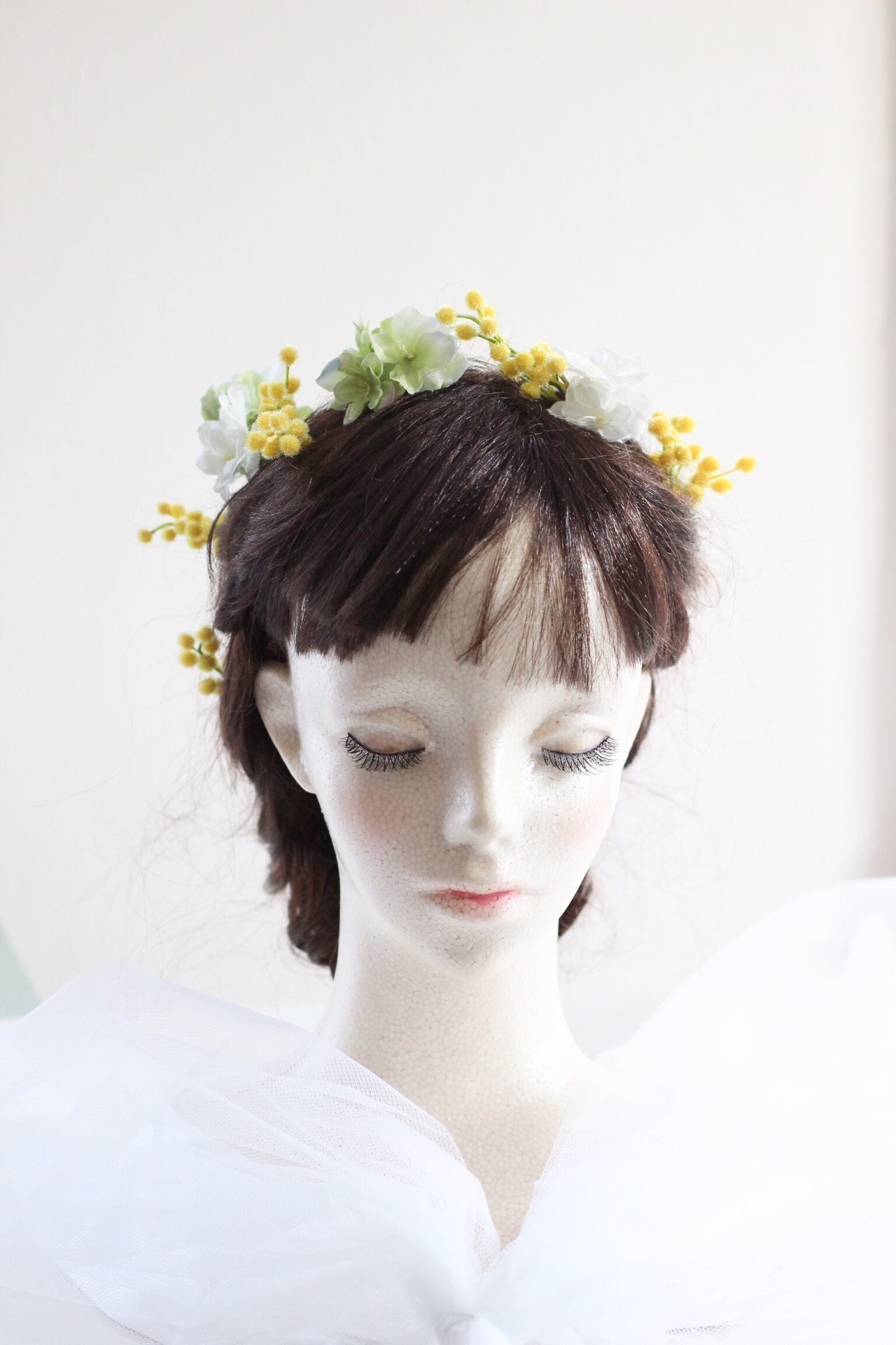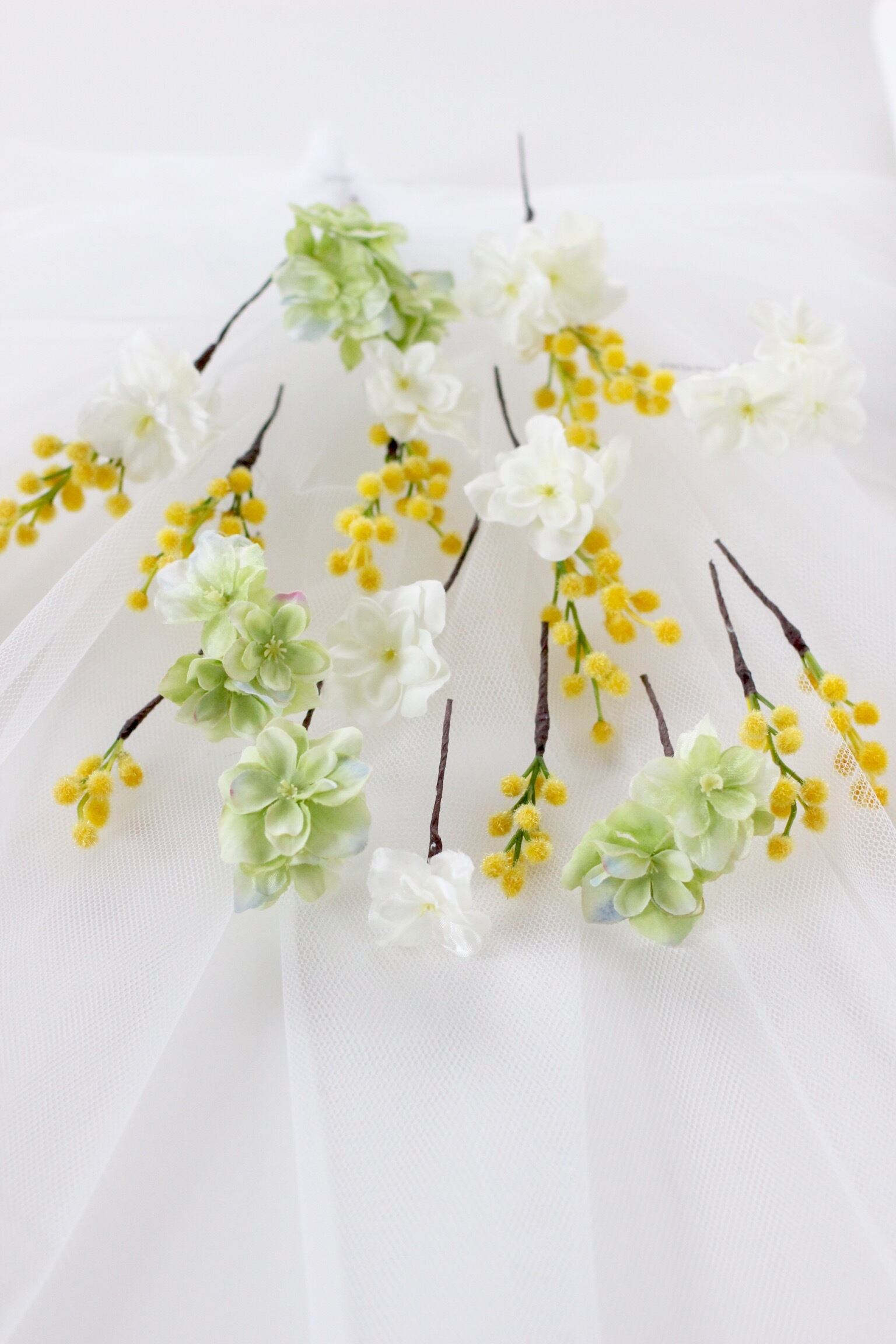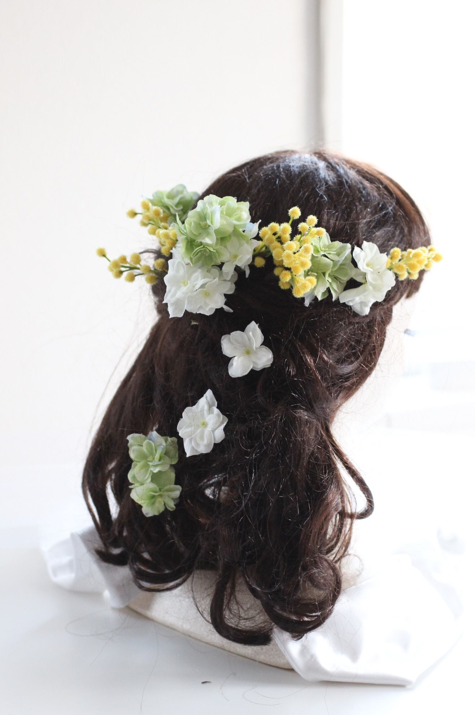 春らしいかわいらしいミモザと、花びらのかわいらしい高級感のある2色の紫陽花のペアパーツ。